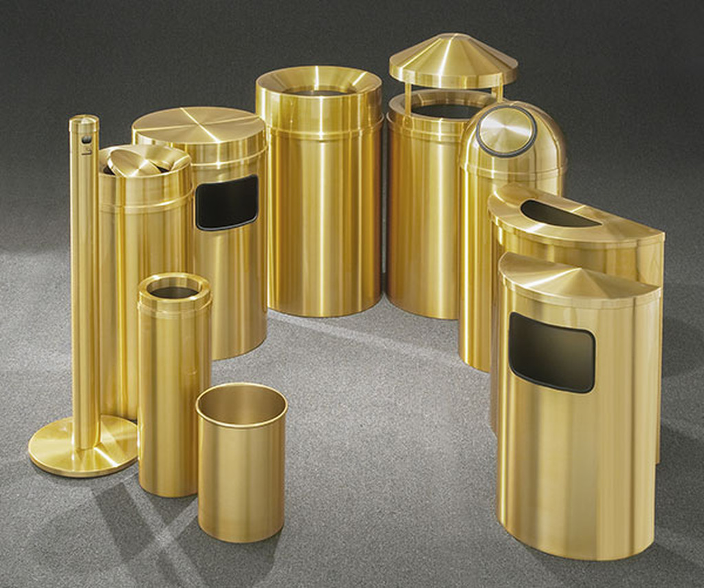 - The “Atlantis” All Weather Satin Brass Waste Receptacles are guaranteed to be tarnish and rustproof. They have a rich, elegant, durable finish.