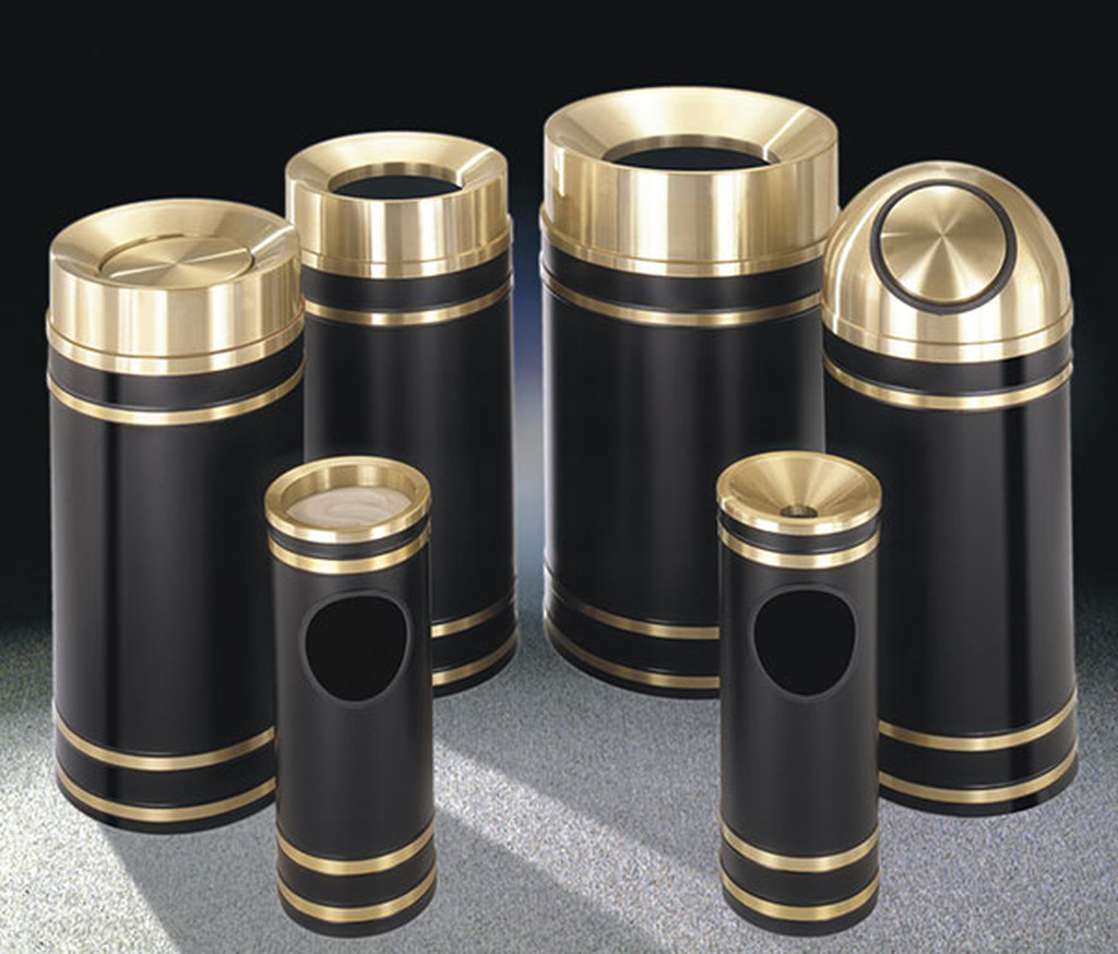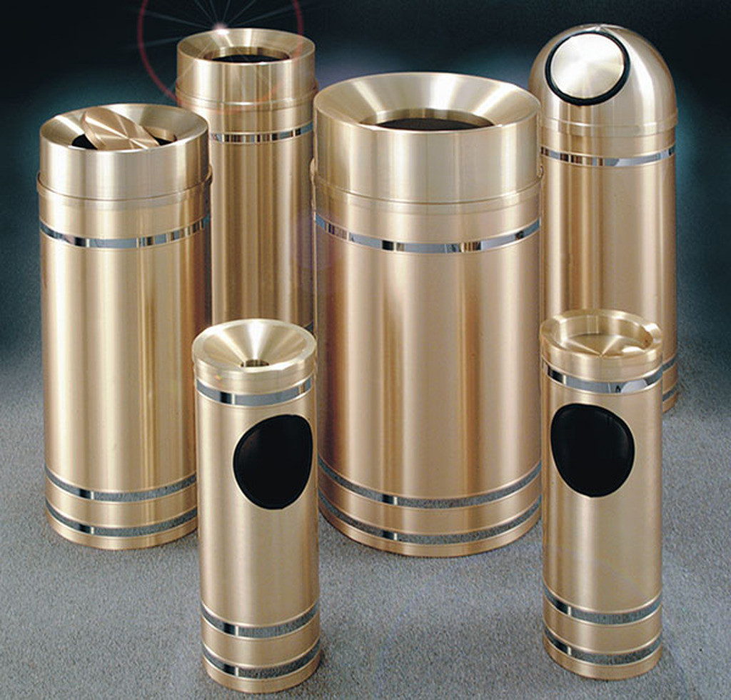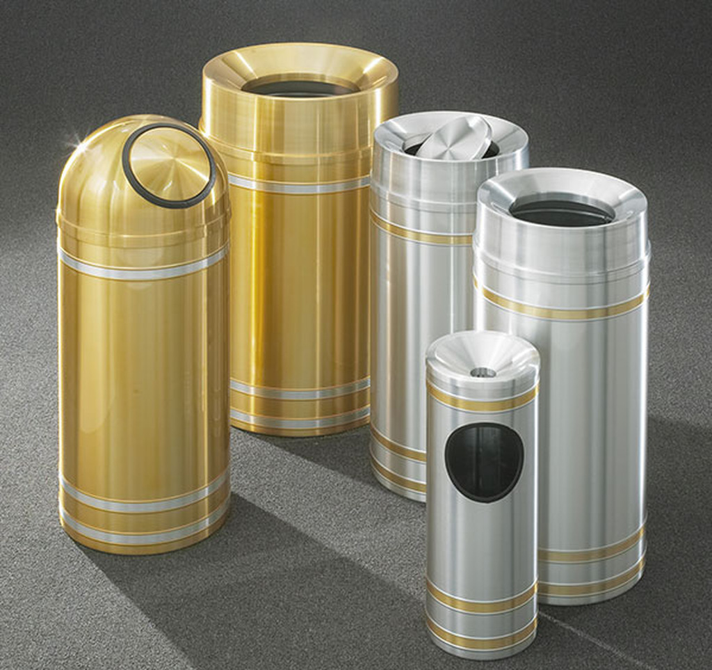 - The “Capri” Banded Satin Finish Waste Receptacles are manufactured in tarnish-proof satin brass or satin aluminum, accented with contrasting metal bands. These sophisticated waste containers are beautifully detailed.