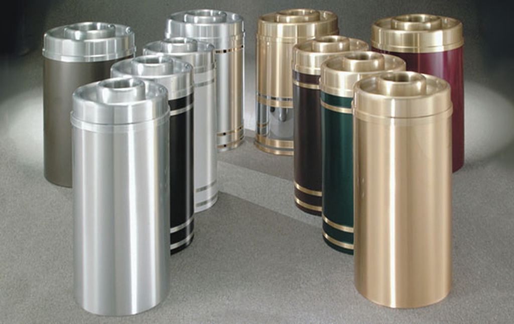 Glaro indoor and outdoor waste receptacles are available in tarnish-proof satin brass and satin aluminum finishes. All finishes for trash receptacles have powder-coat protective surfaces. They are also available in 27 textured and smooth powder coat finishes. View Color Options here.