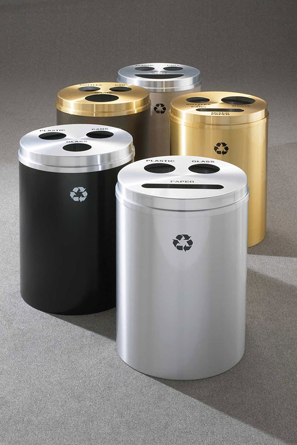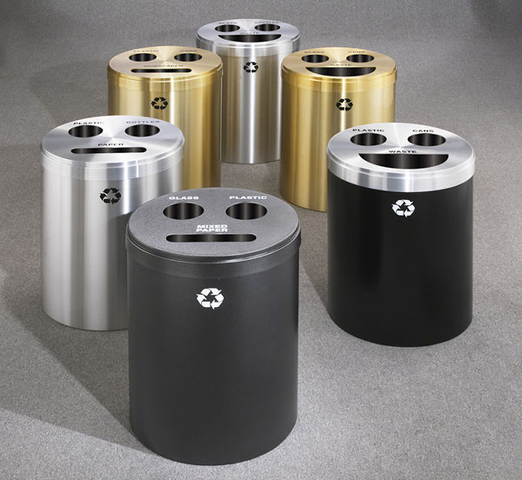 RECYCLEPRO 3 provides 20” diameter receptacles designed to collect three types of recyclables or two types of recyclables plus waste in a single receptacle. Five different openings are available in five possible combinations to allow your facility to easily implement an instant recycling program with minimal space and cost.